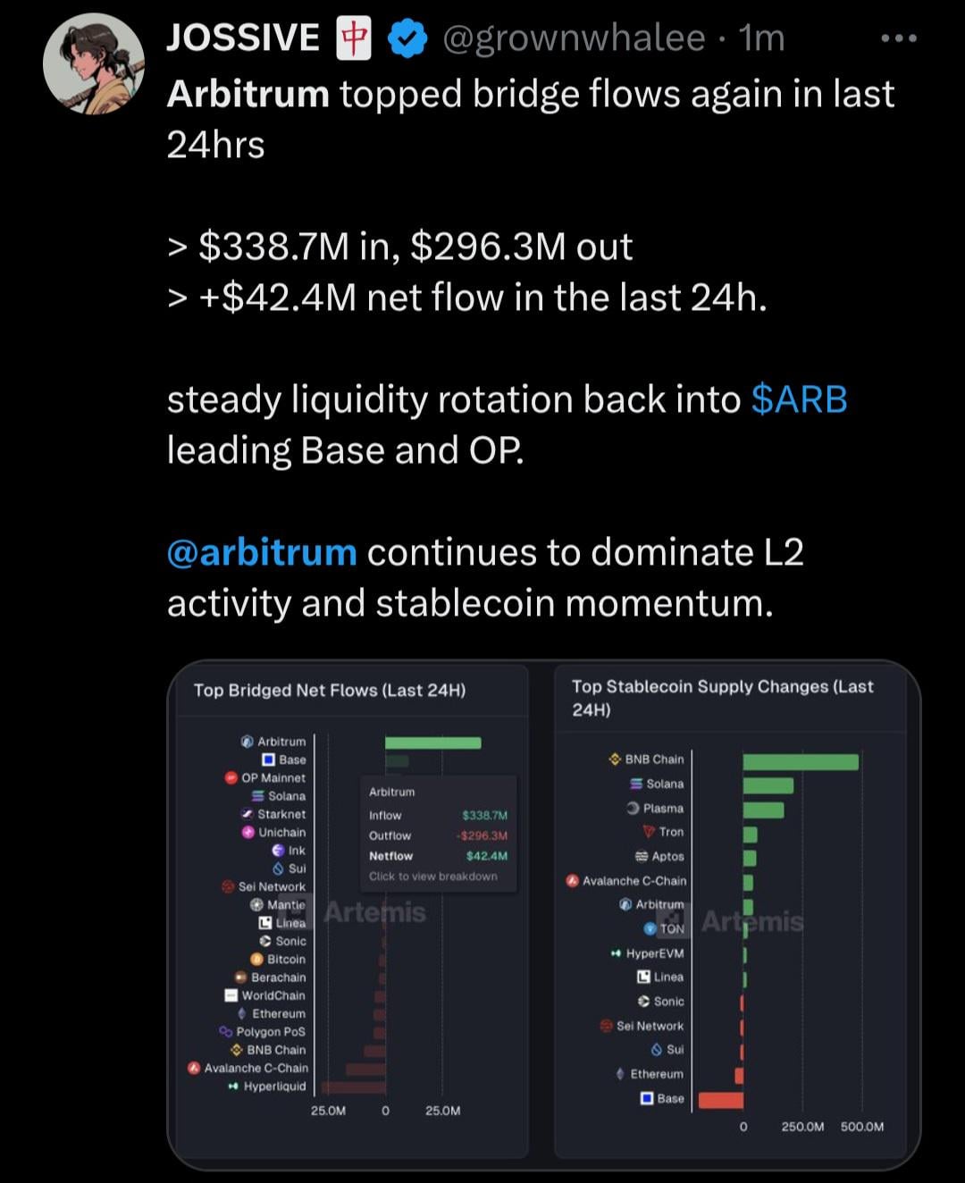 Arbitrum topped bridge flows in the 24hrs