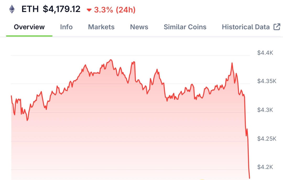 Ethereum fell 1.44% to $4,283.60 in the past 24h, underperforming Bitcoin (-1.44% vs BTC’s -1.44% loss). The dip aligns with broader crypto weakness but shows ETH-specific pressures. Key drivers:
