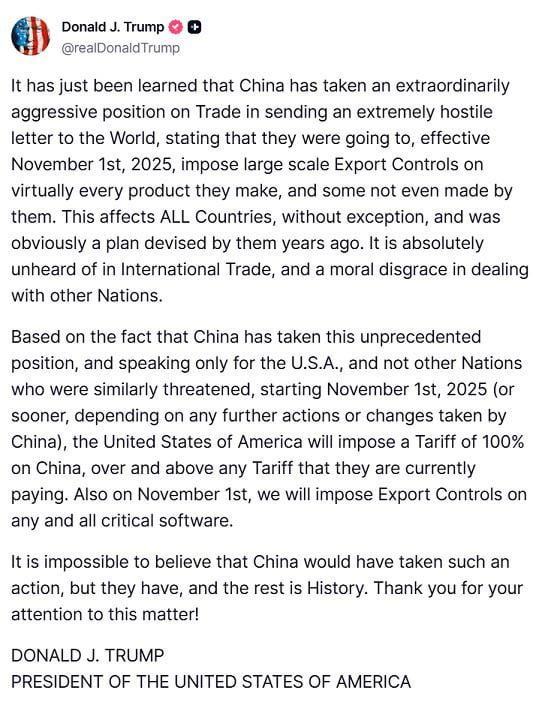 Donald Trump to impose a 100% Tariff to China, over and above ANY tariff that they are currently paying.