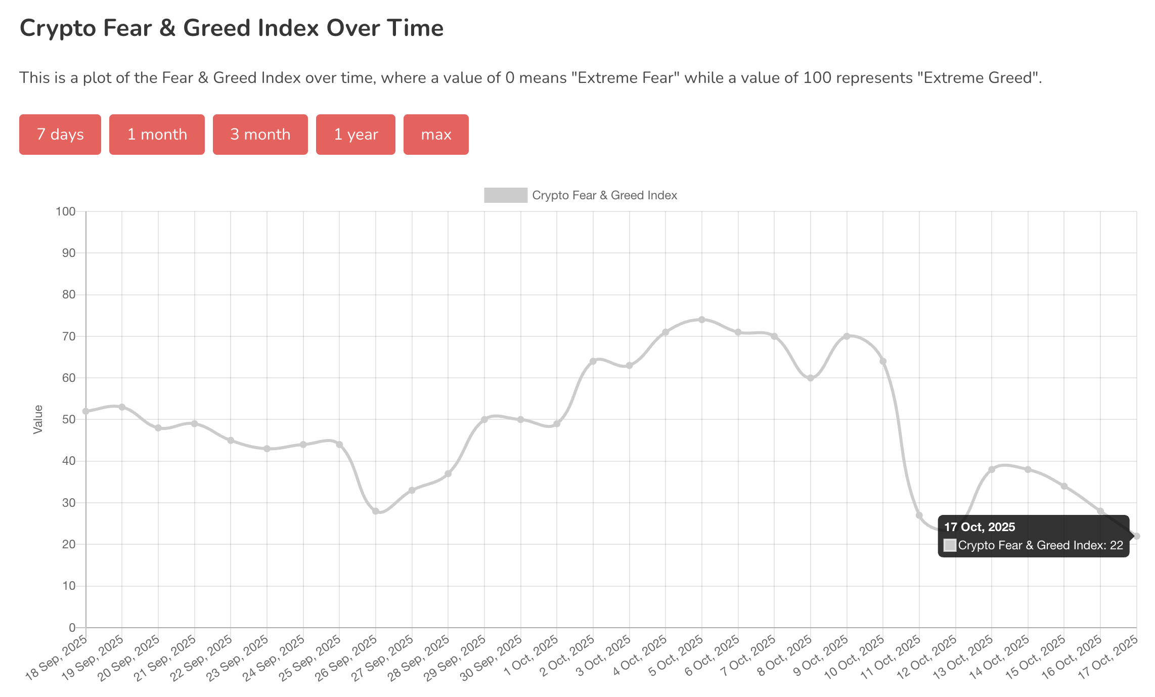 10 days ago: Index at 70 (greed). Today: 22 (extreme fear). Last time we hit this level? April 2025 with Bitcoin at $80K.