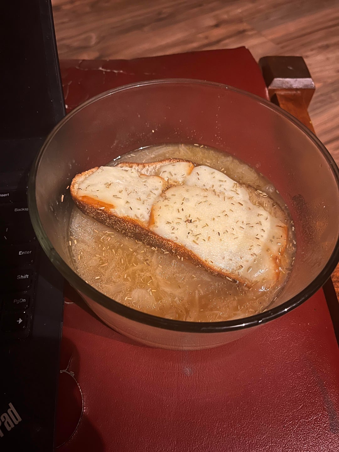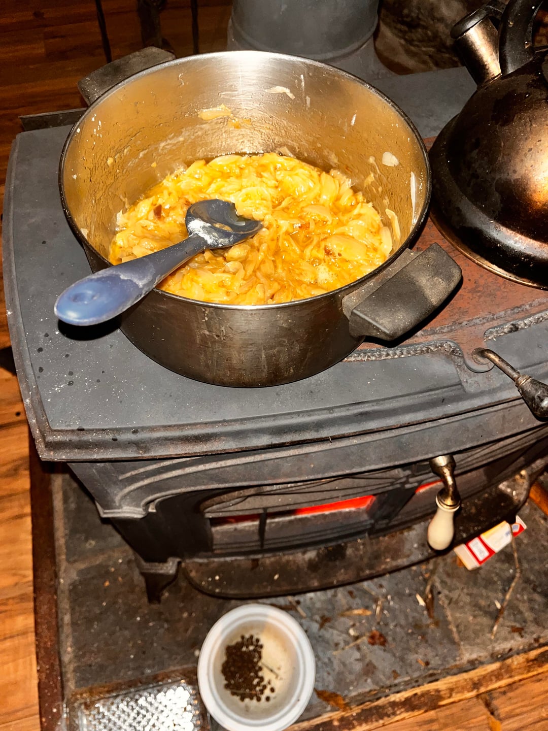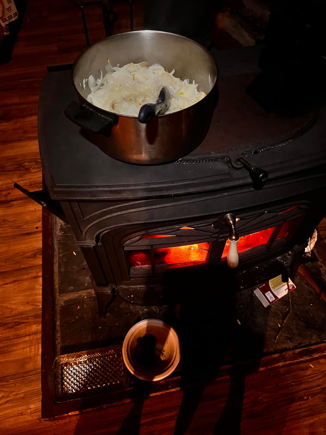 The temps have been dropping where I live and the winds from the northwest have a bite to them. Living off grid in a yurt means it’s time to have a small fire from gathered branches and limbs to knock the chill off before settling in for the night. ( I try not to use wood from my woodshed until December). No better time than now to use up a sack of onions that have been hanging around and make some French onion soup on top of the woodstove. I browned off 7-8 large onions that were sliced thin. The smell they gave off would make a desert drool. Once they were done I tossed in more butter and a palmful of flour to make a roux, cooked that till the flour was done then added some water and homemade beef stock and brought back to a simmer. In the meantime, as the fire died down, I toasted a couple slices of sourdough over the coals and then melted some smoked Gruyère on top of them. Then sat down to a comfort food meal that filled my belly and sent me packing to bed.