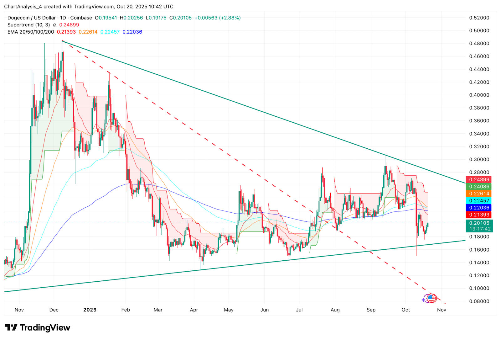 - Dogecoin price today holds near $0.201, with buyers defending $0.18 support while resistance remains capped at $0.25.
