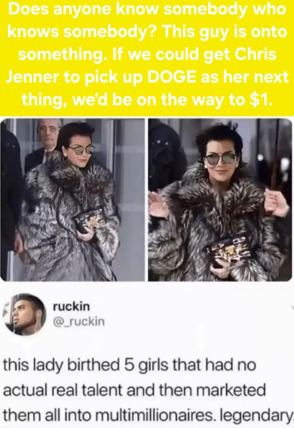 We need some of that Jenner marketing ability in the DOGE community. https://i.redd.it/ewucn1sd1q0g1.jpeg Posted by Low-Hold-8563