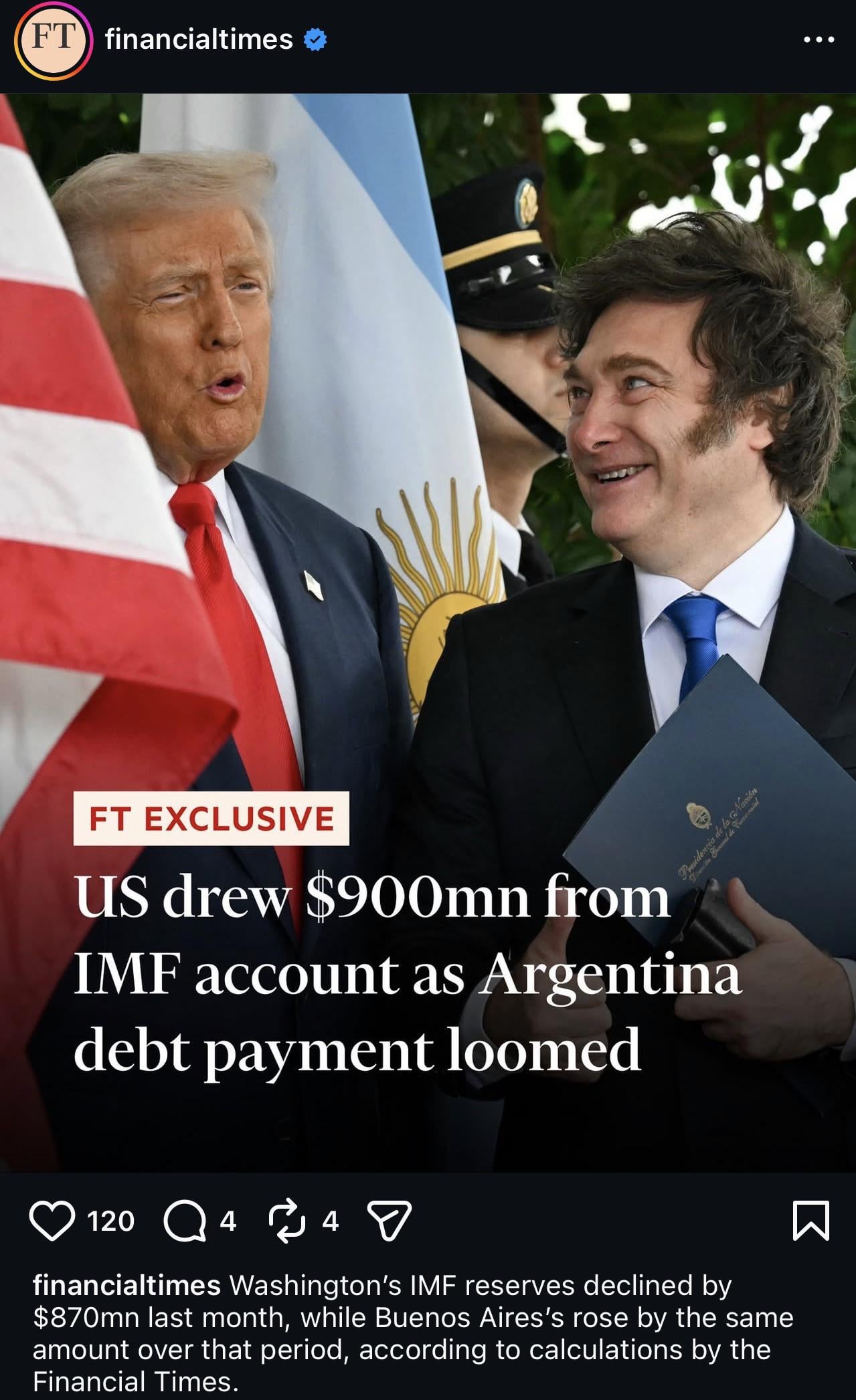 The US drew nearly $900mn of its IMF reserves as Argentina received an equivalent amount ahead of a critical debt payment, transactions analysts pinned on Washington’s effort to bolster Javier Milei’s government.