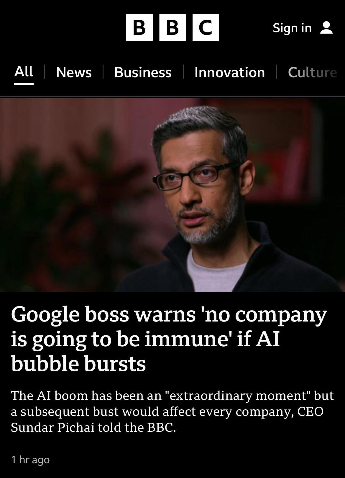“Asked whether Google would be immune to the impact of the AI bubble bursting, Mr Pichai said the tech giant could weather that potential storm, but also issued a warning.