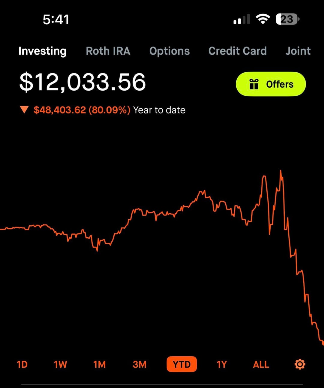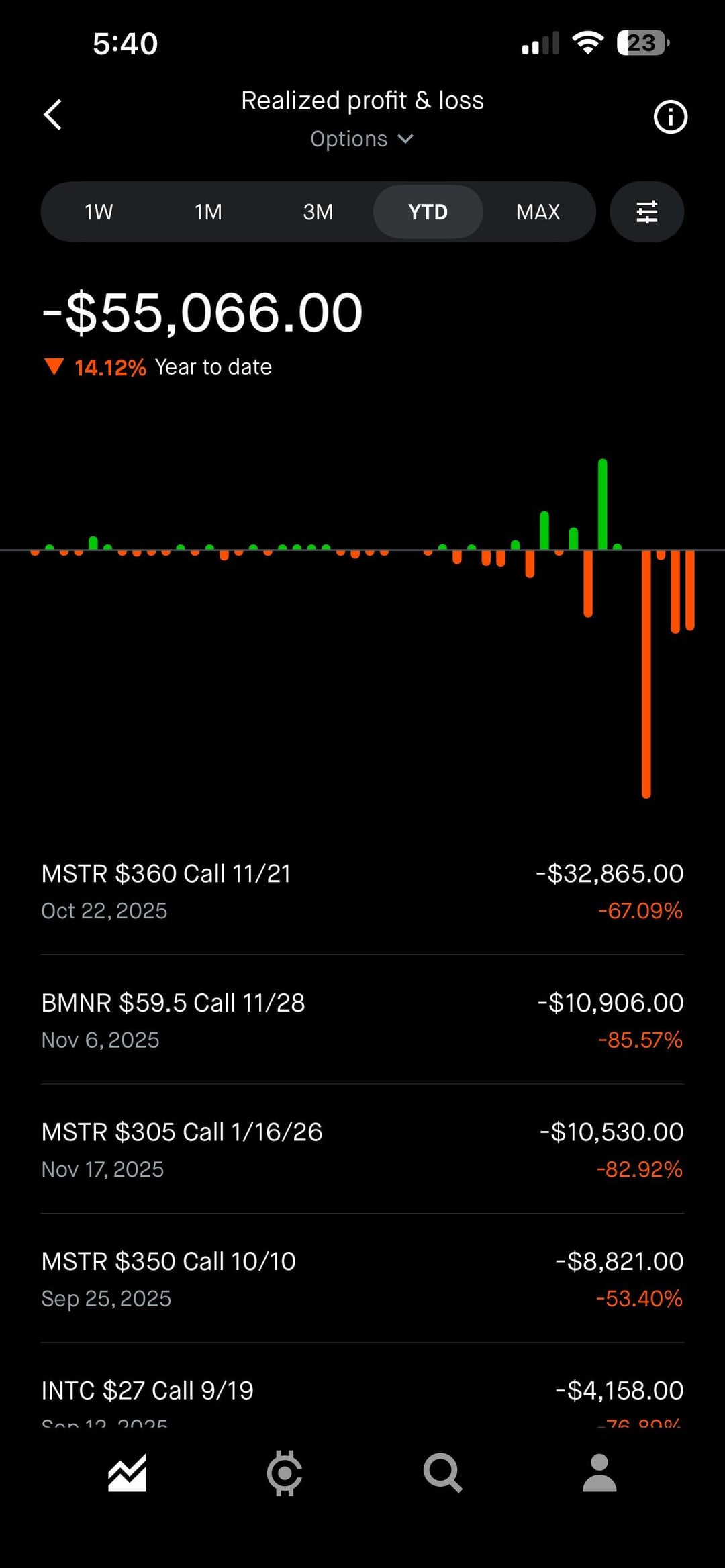 Hi im 22 and in college. I spent the last five years working hard to save this money, only to lose most of it in two months. I was in denial for a long time there were many chances to cut my losses, but I kept adding to my positions. $MSTR and $BMNR kill my portfolio.