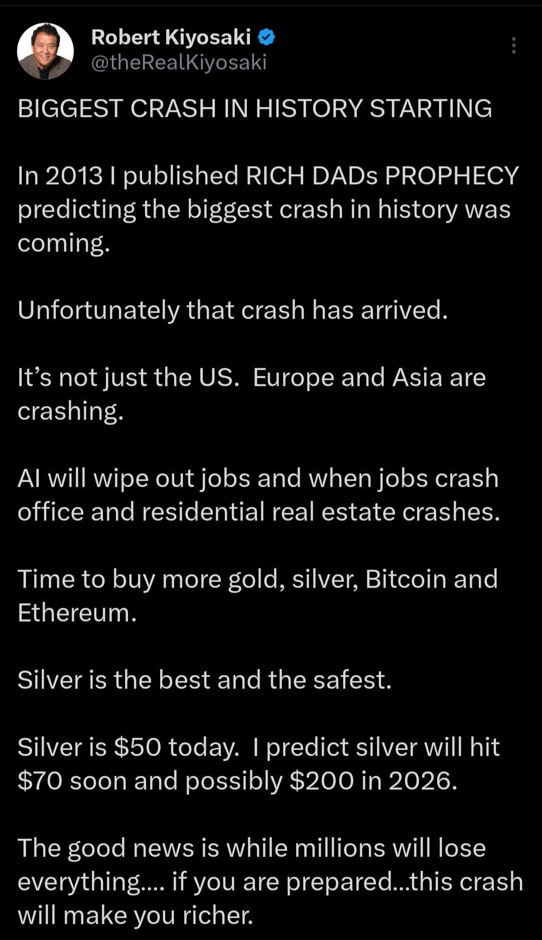 Kiyosaki is sounding alarms again and people are acting like it is the start of a full market breakdown. Silver is sitting around $50, so that part of what he said lines up, but the rest feels like the usual cycle of dramatic predictions.