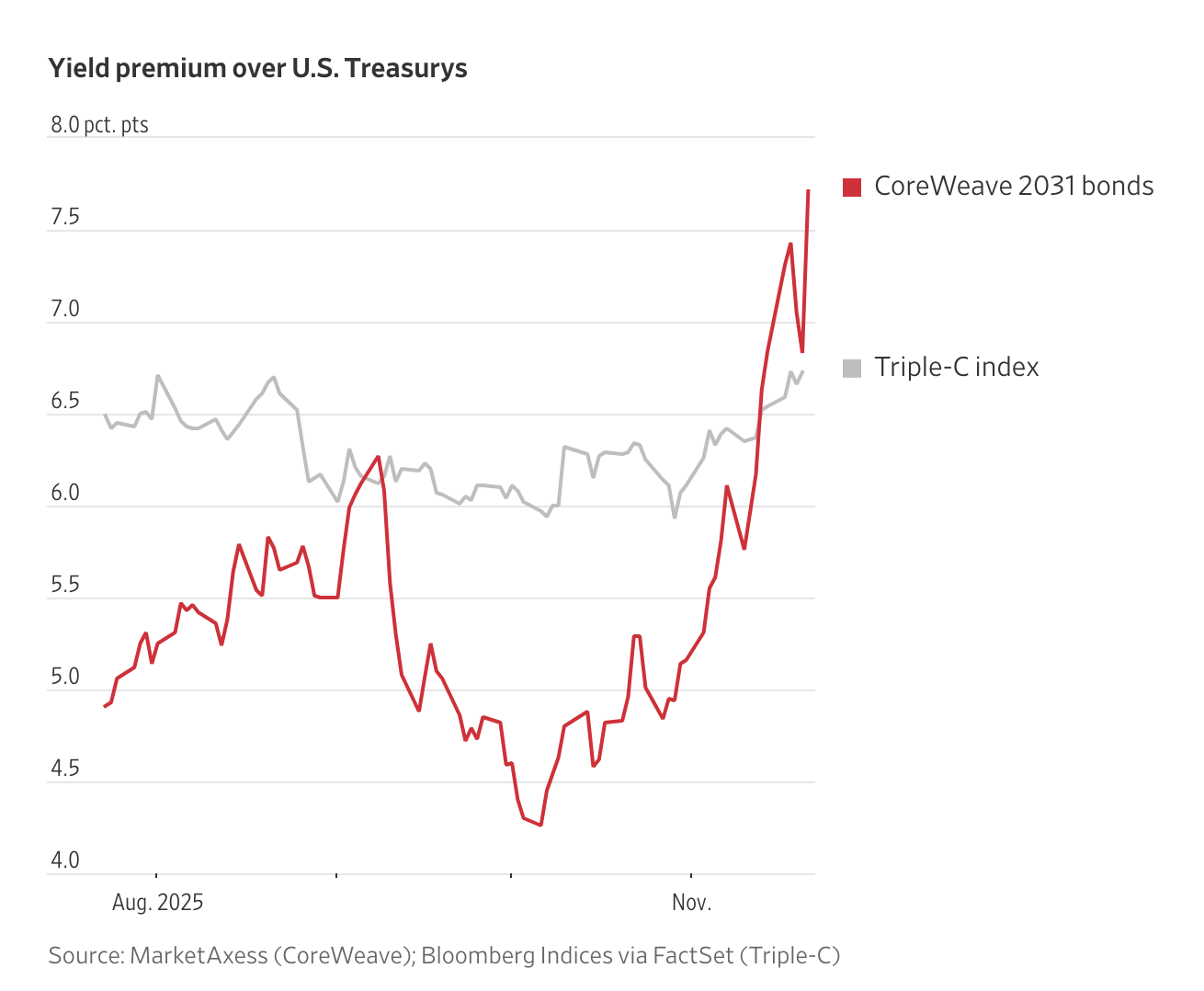 Other companies already are operating in that smaller debt market. Those include CoreWeave, the lone major AI cloud provider with subinvestment grade bonds. Its bonds due in 2031 that were issued in July recently traded at 92 cents on the dollar. That translated to a roughly 11% yield, about the same as the average triple-C rated bond—at the bottom of the ratings spectrum.