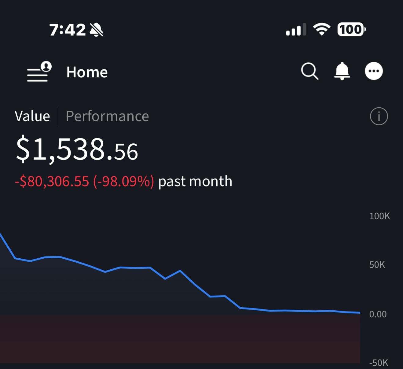 Every time I see one of these posts I just think to myself why? Hopefully this is just a side account he’s cratered and not life savings.