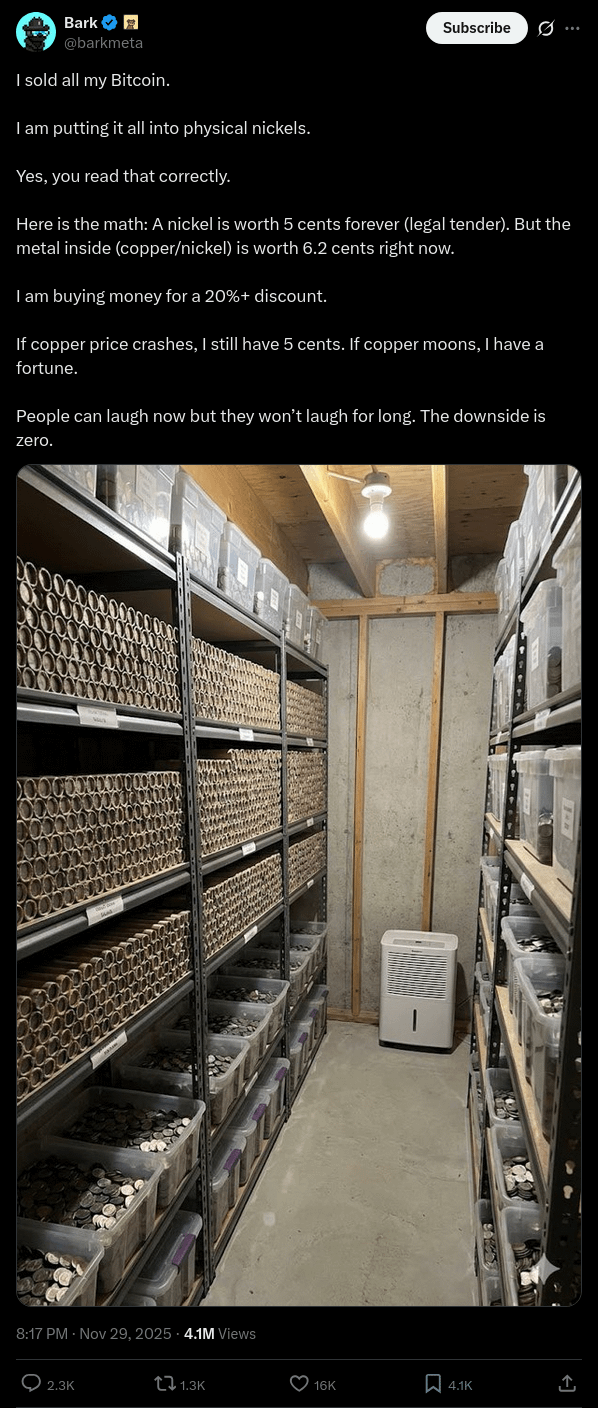 I hope for this guy’s sake he just found a picture somewhere or shitposting with AI. The only hope is if the US just decides to get rid of nickels and lift the ban. But by that point everyone would be doing the same shit so it would be a loss anyway unless you were lightning quick.