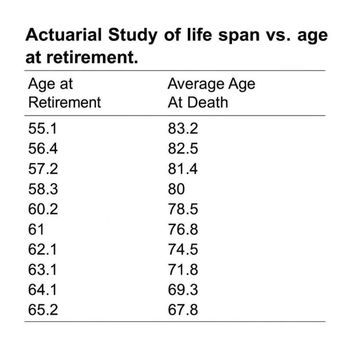 4. For context… this inverse correlation table is an urban legend starting with Boeing engineers in the early 2000s (no connection to other Boeing engineer memes). It’s been debunked multiple times (by Boeing and other studies) and fails the simplest logic. The vast majority of people retiring early are forced to because of health and/or forced retirements (which puts them at an economic disadvantage). Those that work longer, right or wrong, are mentally and physically capable later in life and have funds. Health and wealth is actually correlated to longevity.
