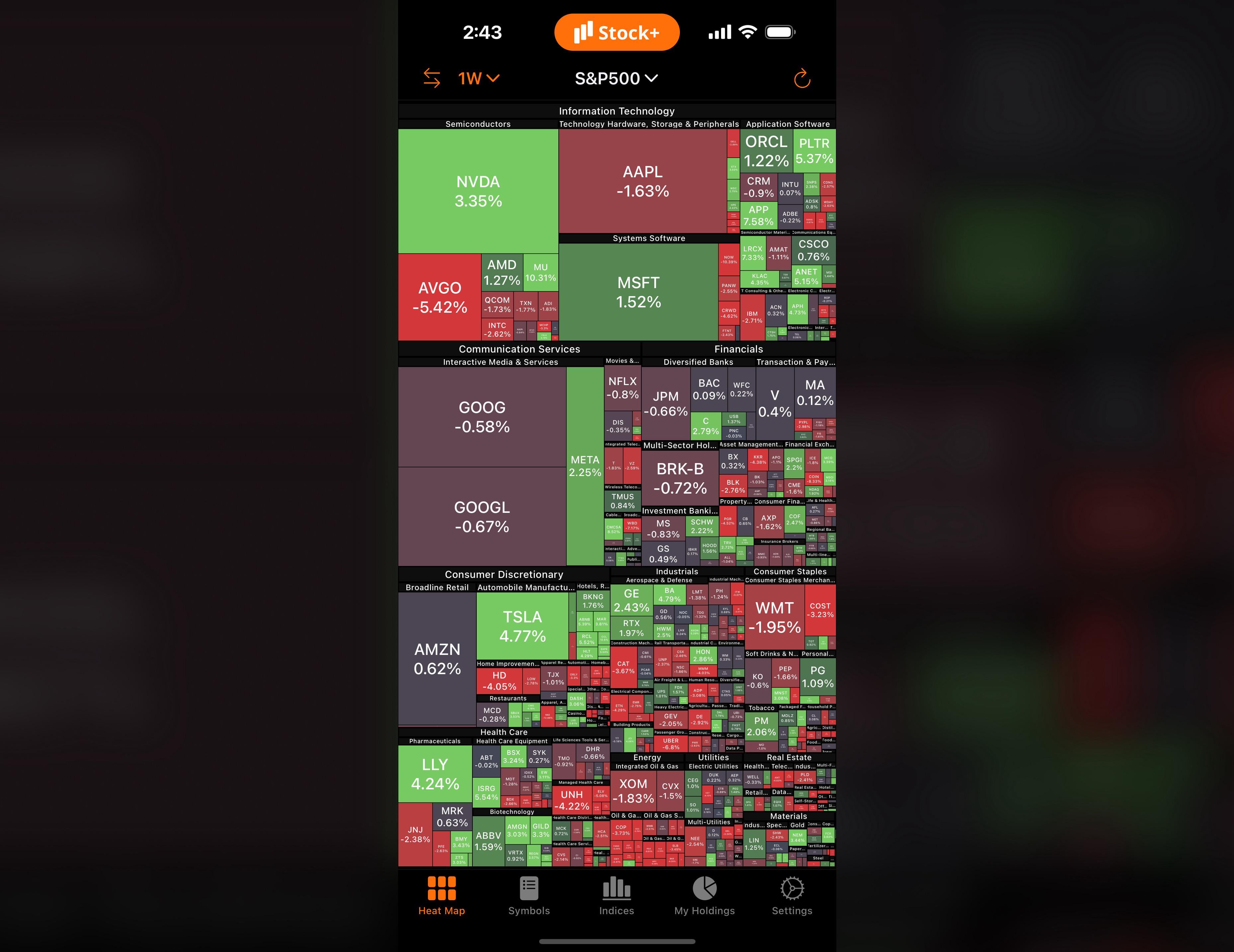 ❓ Note: Many people have asked where screenshots come from in my previous posts. I'm using Stock+ on iPhone and iPad. You can find it on the App Store. If you're using Android, I'm now sure if it's available, but you can try searching "Stock Map" or "Heat Map".