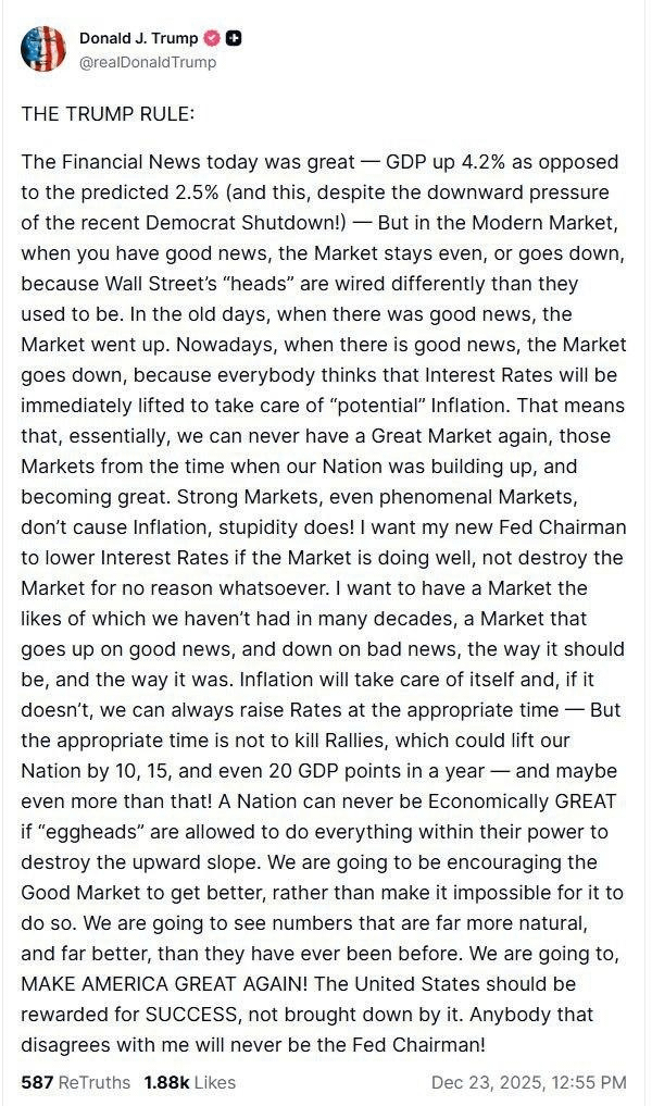 President Trump said, “Anyone who disagrees with me will never become the Chairman of the Federal Reserve.”