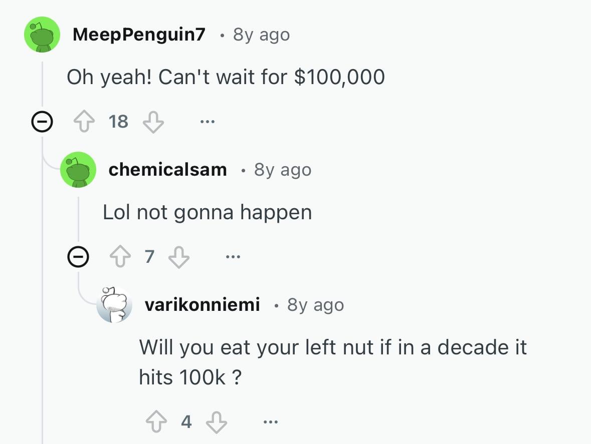 Sorry_Degree_7933 on December 27, 2025 12:01 pm People laughed at $1k, then $10k, then $100k. The pattern isn’t belief, it’s time and adoption.