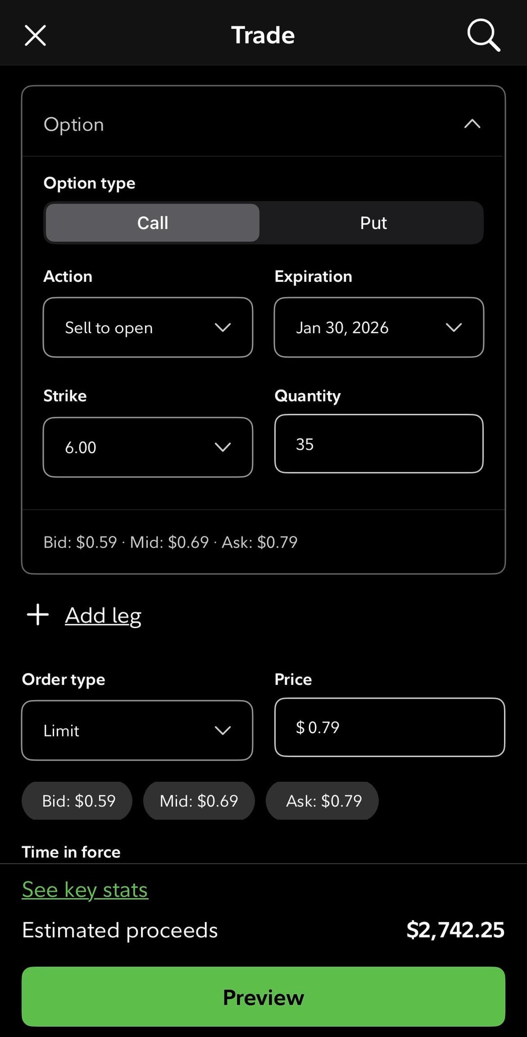 So I’m holding 3500 shares of a stock and my cost basis is 6.50. I’m down $1700 at the moment. The stock currently trades at 5.94 after Fridays close. I’ve never sold covered calls before so I’m a bit confused. I have a mock trade pulled up and If I sold 35 $6 covered calls with a 1/30 exp I could collect $2742.25. I would essentially make money on this otherwise failed trade and my shares would get called away immediately which I’m fine with. Did I stumble on my golden ticket out or am I trippin? Can someone analyze this