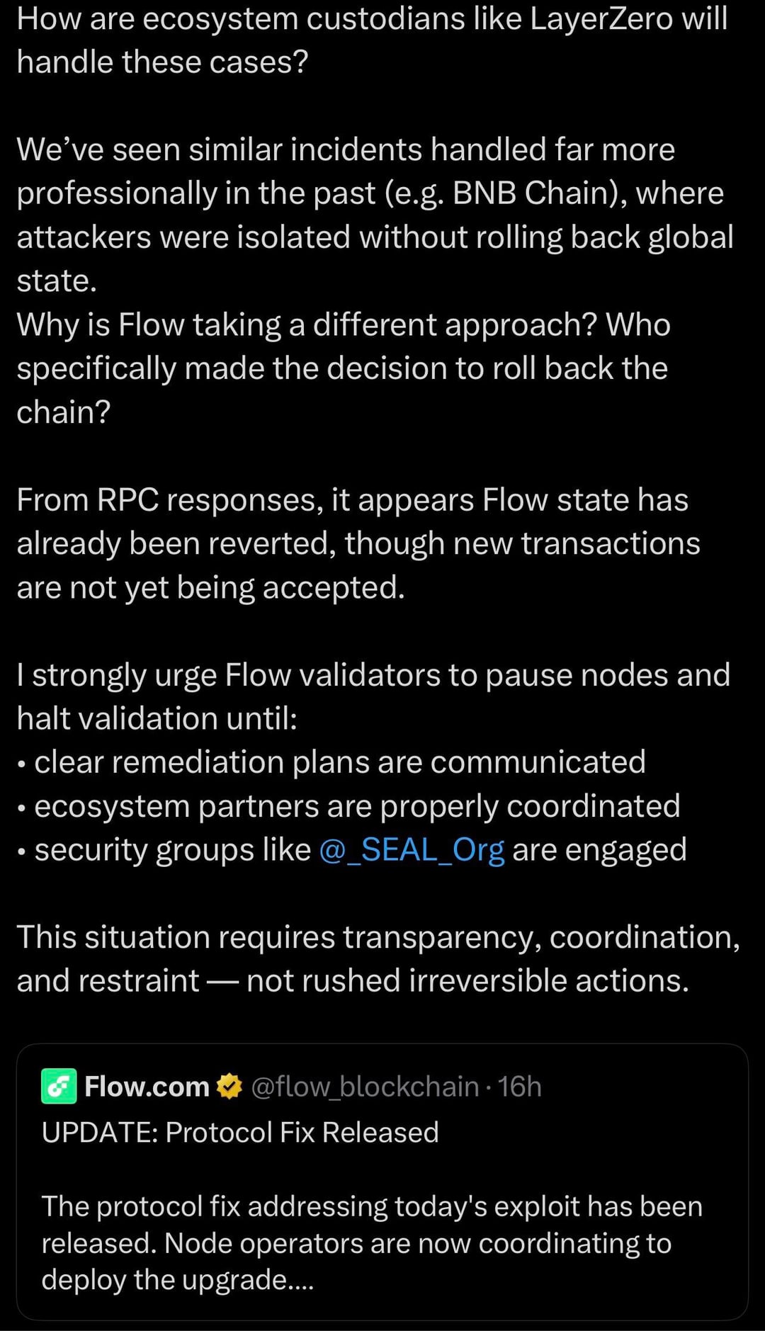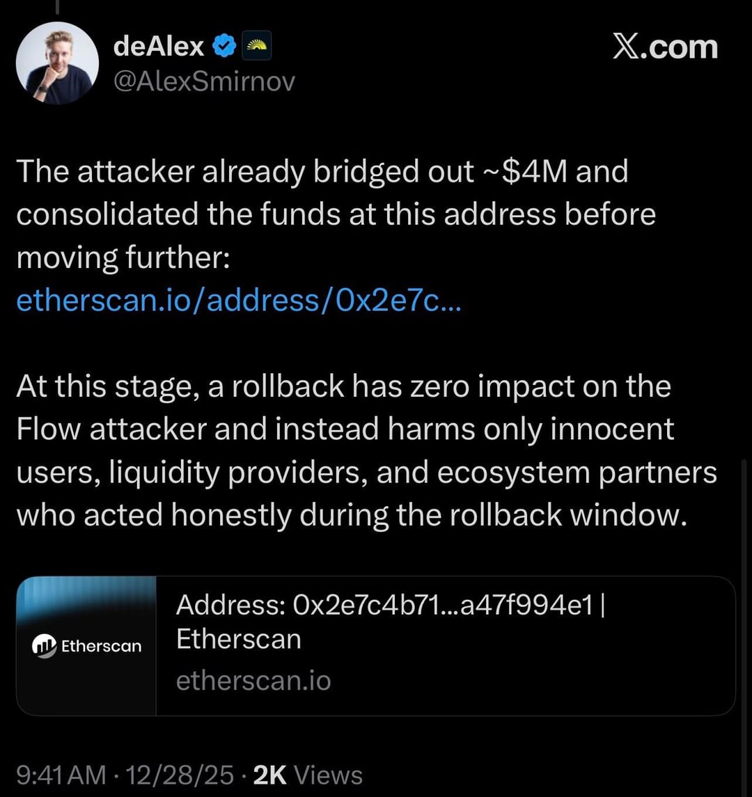 Flow Blockchain exploited. Malicious actor bridged out $4M. Flow rolls back the chain after hacker bridged out (hacker keeps funds), new users bridge in (users lose funds) and didn’t communicate with major bridges. Flow is receiving a ton of criticism for their actions