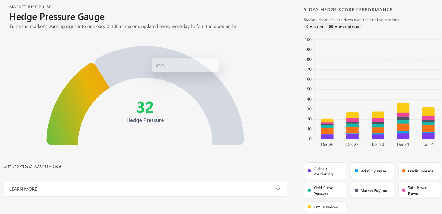 So I built a single dashboard that combines things like VIX term structure, SKEW, put/call ratios, and drawdowns into a simple hedge pressure gauge.