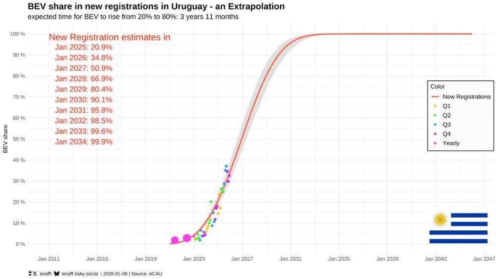 πΊπΎ Uruguay – December 25 – BEV Trajectory32.5% BEV2.1% PHEV65.4% ICE (of which 13.3%p were HEV)Trailing 12 months are:28.4% BEV1.5% PHEV70.1% ICE (of which 10.3%p were HEV)Graphs are available in the Gallery: leraffl.github.io/LeRaffl-Gall…