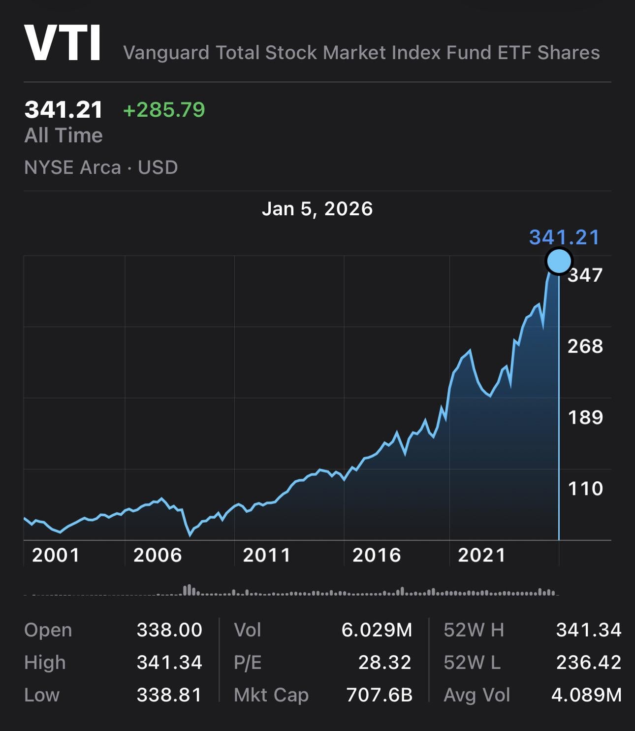 How many of you are long term holders of VTI? I started investing in 2018 (around the $180 mark) after reading one of Jack Bogle’s books. I literally have everything in VTI and so far my unrealized gains are coming in at 57.4%.