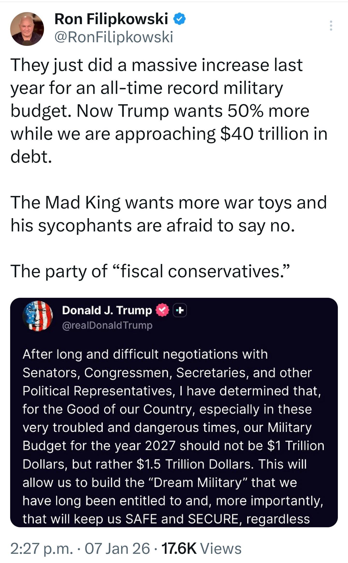 I don’t how many times I’ve heard conservatives complain about taxes, government spending being “out of control,” our national debt but then turn around and support a trillion dollar military while also wanting to lower taxes, especially on the wealthy, and even support abolishing income taxes, calling taxes “theft.”