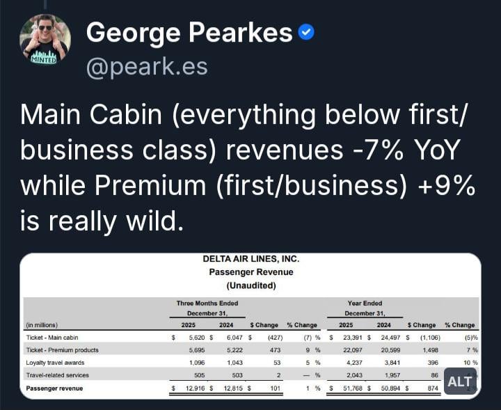 The K-Shaped Economy: Delta Airlines revenue up for first/business classes (+9%) but down for economy (-7%) https://i.redd.it/gqeec6x6i7dg1.jpeg Posted by Educational_Net4000