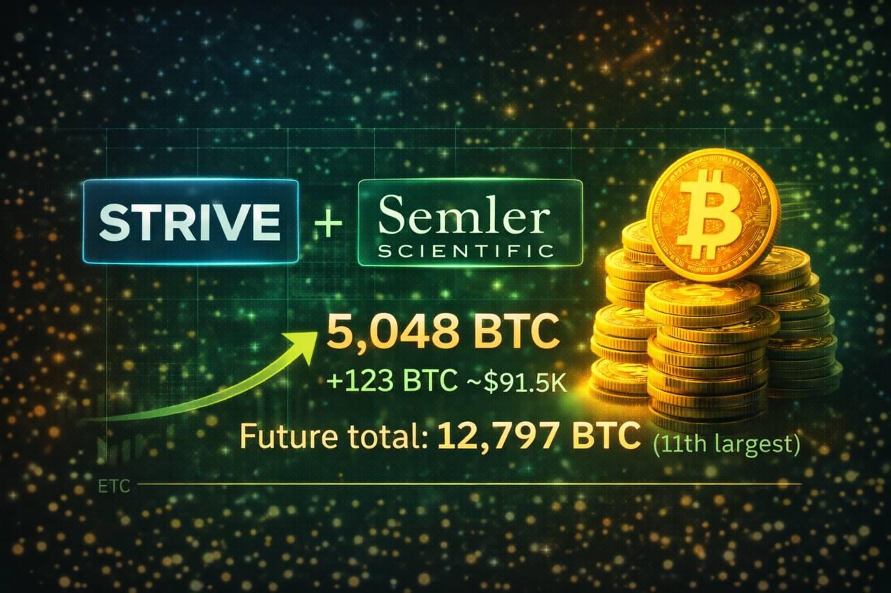 Strive (ASST) is acquiring Semler Scientific (SMLR) in an all-stock deal. Semler already holds 5,048 BTC, so Strive gets the treasury as part of the acquisition. They also bought 123 BTC around ~$91.5K.