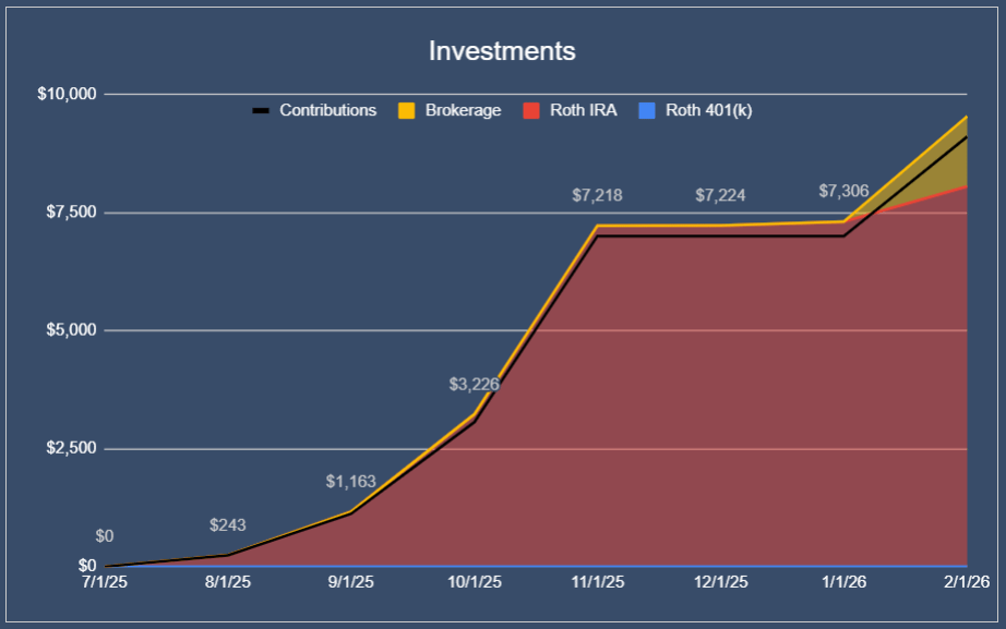 I currently do not have access to a 401(k) or an HSA, as I need to be employed at my company for 1 year and our insurance plan does not allow for HSAs, respectively. So the money on top of the Roth IRA that I would be investing into retirement accounts is going into my brokerage account for now.