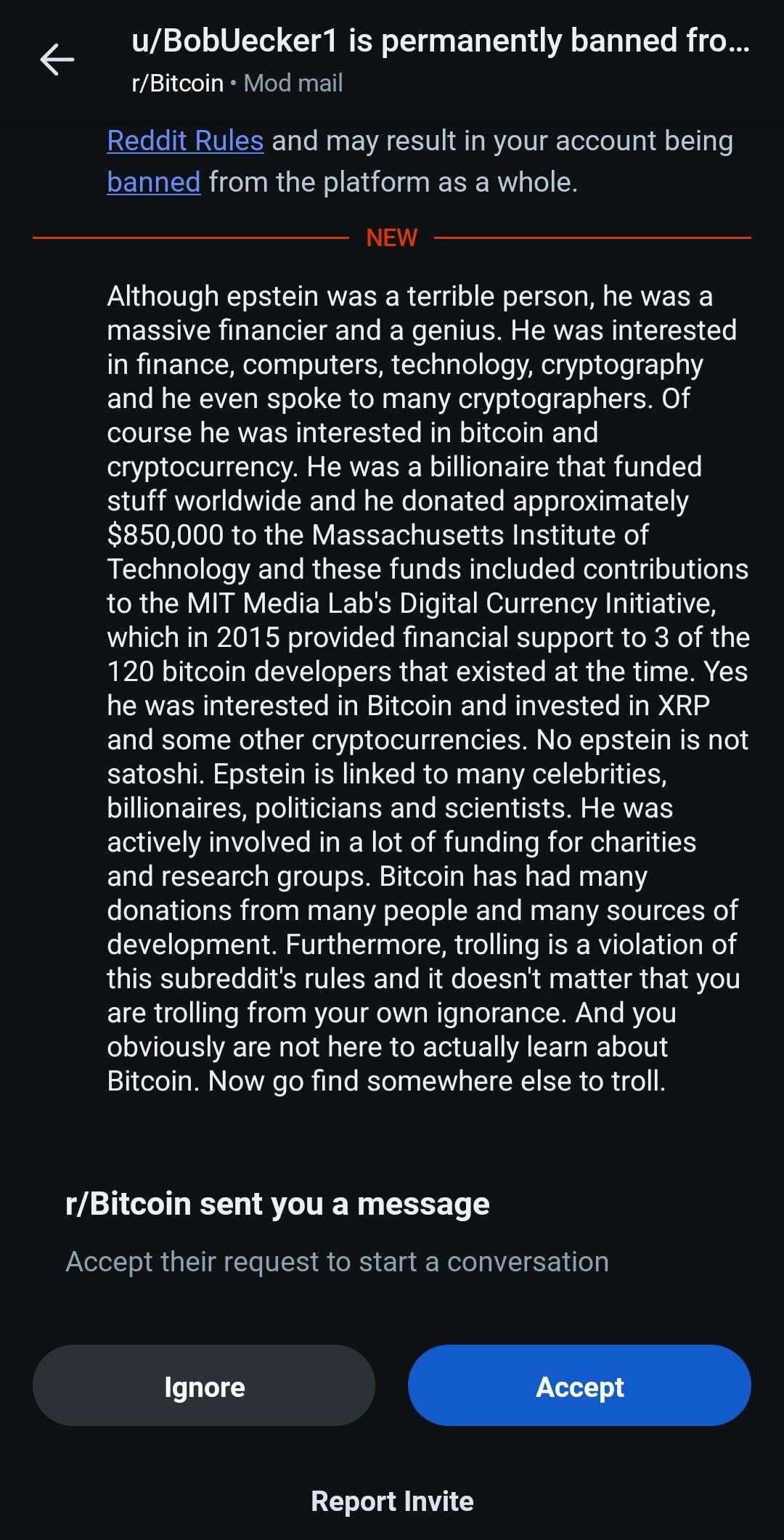 Came here to see if this was here, comical that they are banning over talking about how BTC funded a global pedophile cabal.