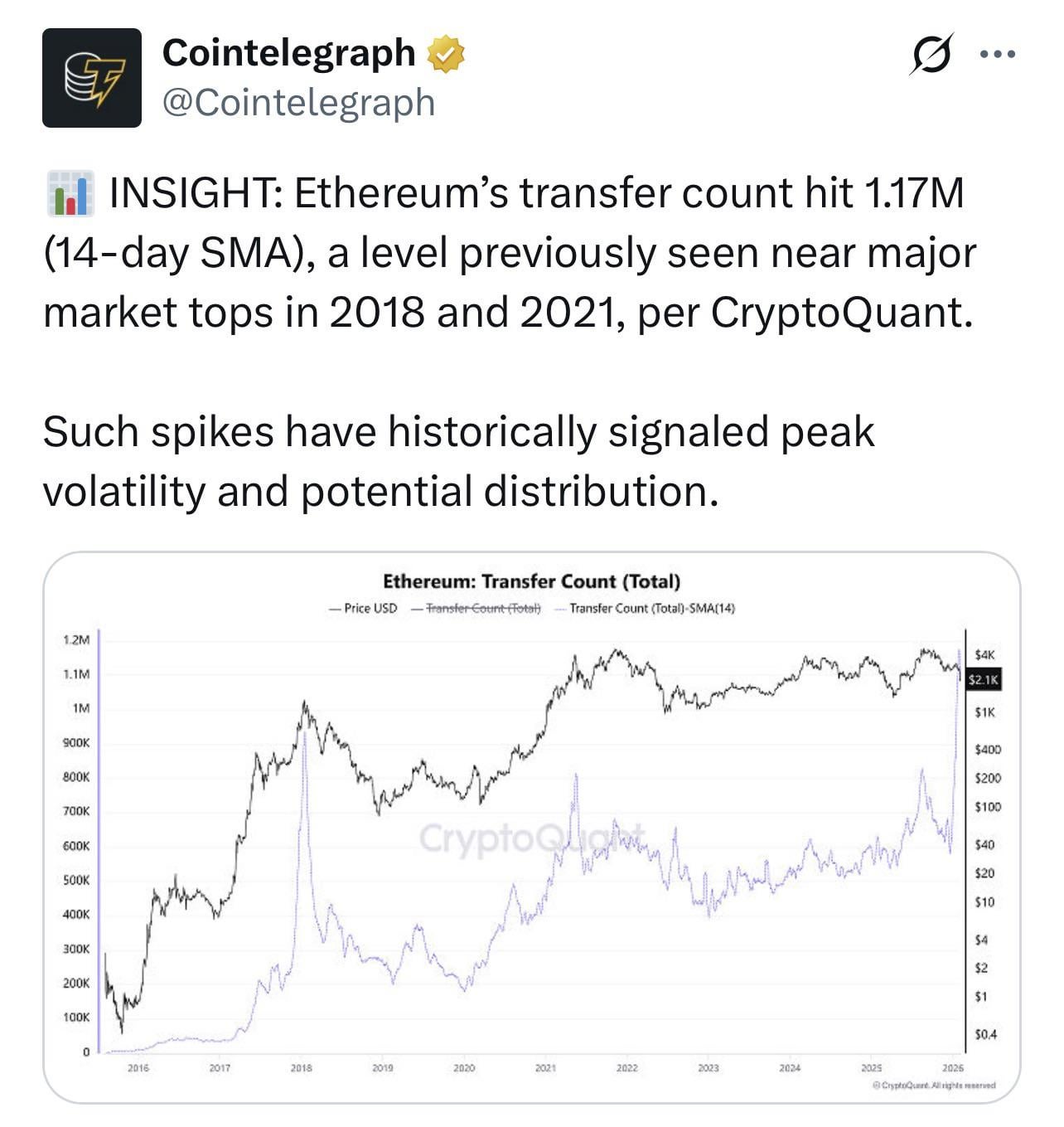 Ethereum’s transfer count hit 1.17M, signaling peak volatility and distribution https://i.redd.it/8yll577fbohg1.jpeg Posted by Creative_Ad7831