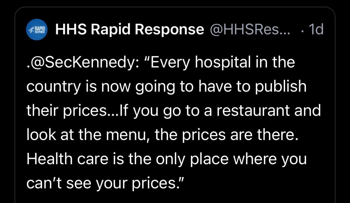 This has been a thing for at least 5 years… what is he talking about? [https://www.aha.org/fact-sheets/2023-02-24-fact-sheet-hospital-price-transparency](https://www.aha.org/fact-sheets/2023-02-24-fact-sheet-hospital-price-transparency)