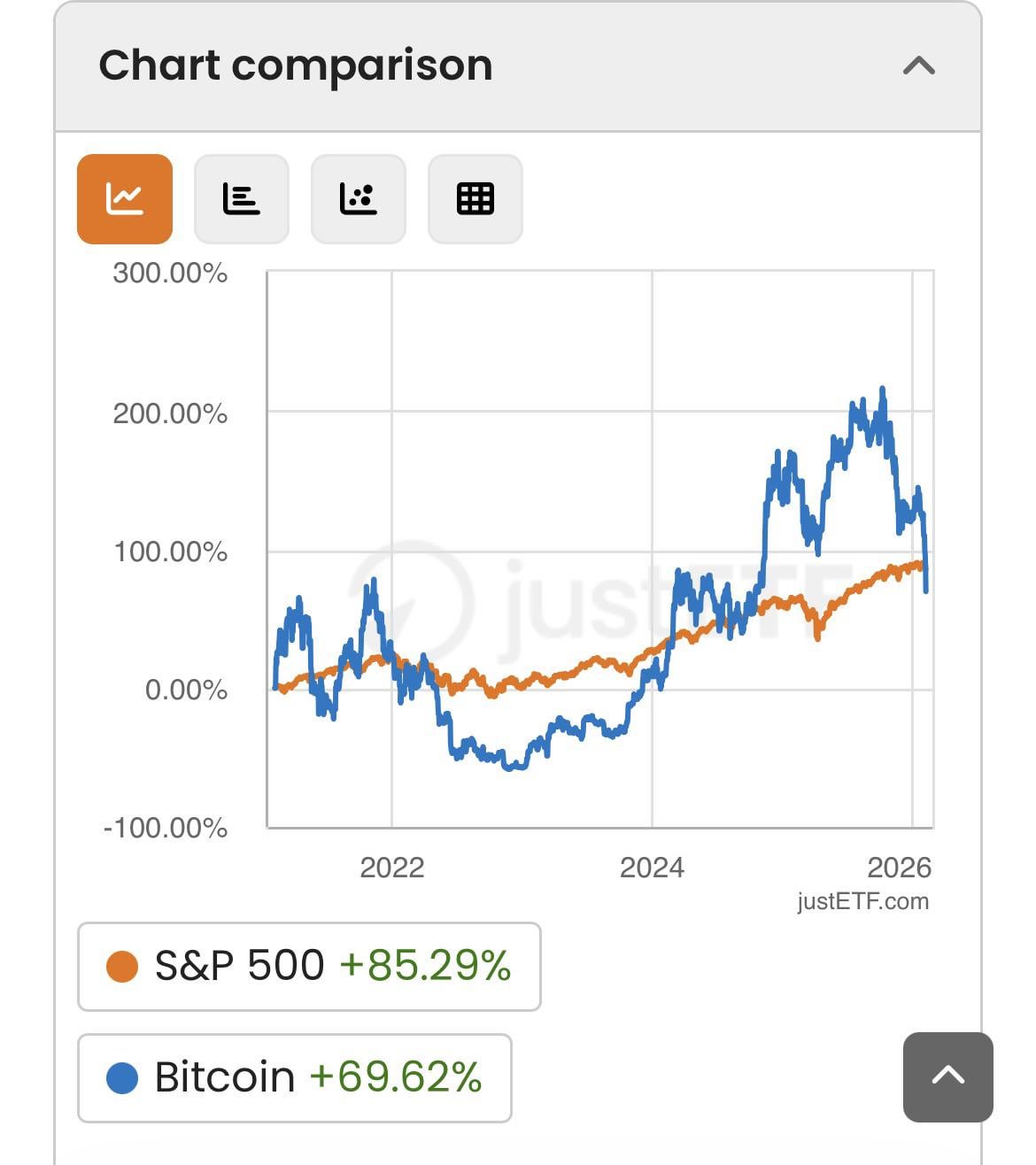 I looked at a straight 5-year buy and-hold comparison over that period Bitcoin is up about 70%, while the S&P 500 is up roughly 85%. Same timeframe.. no trading, no timing the market, just holding…