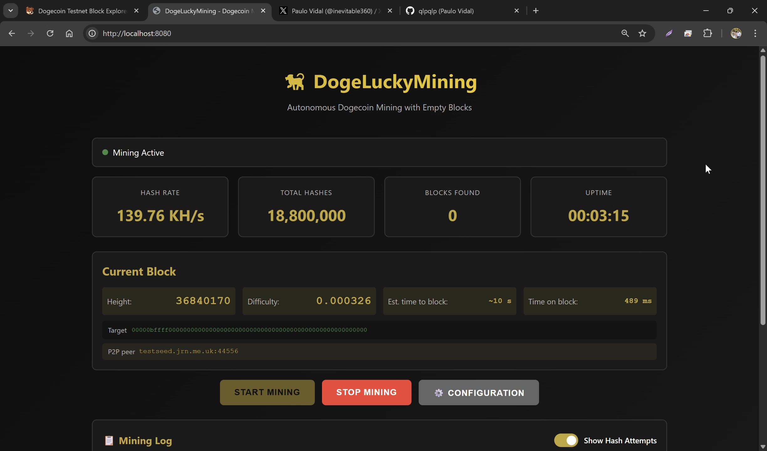 Testing a lot the Doge Lucky Miner that Im coding for several months and on the last days in parallel with other Dogecoin projects and wen I started to test on the #Dogecoin Testnet I found that someone is testing ~500ms Doge Blocks 😱