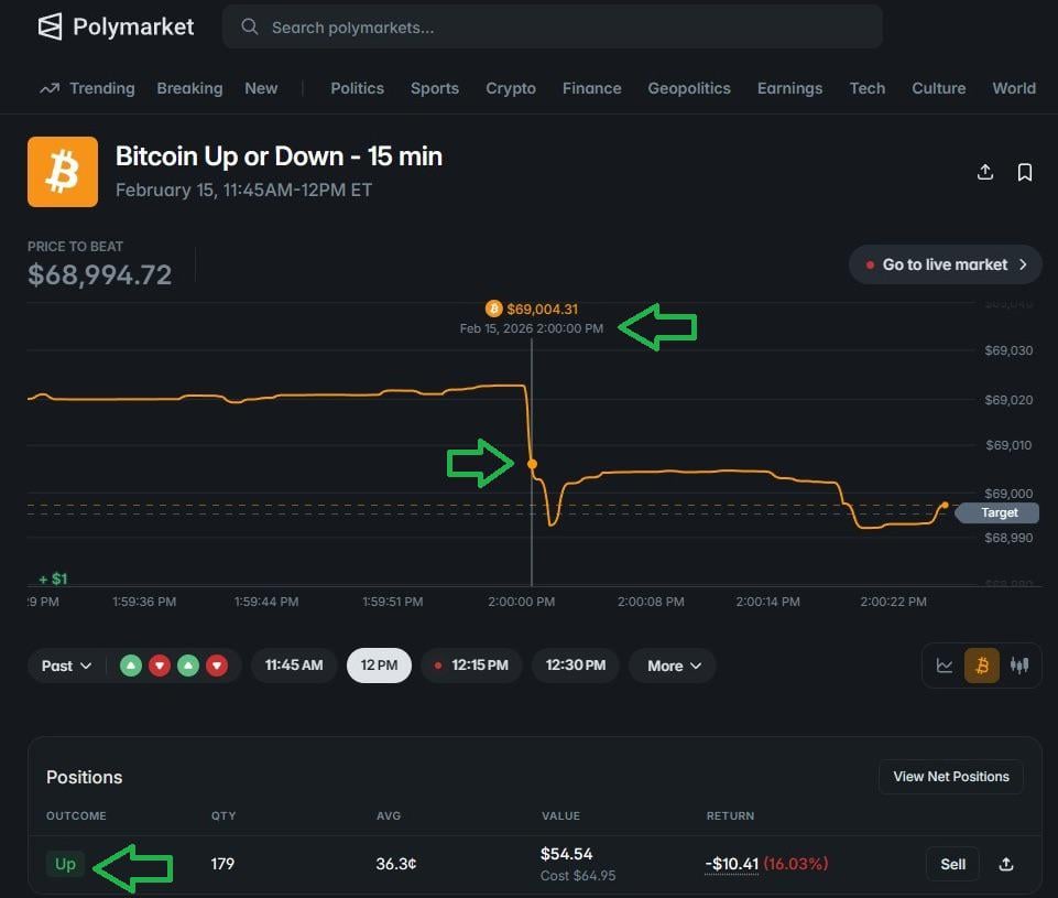 I bet on the 15-minute market, the closing time was favorable to me (UP) and then (hundredths of a second later), they pushed it down.