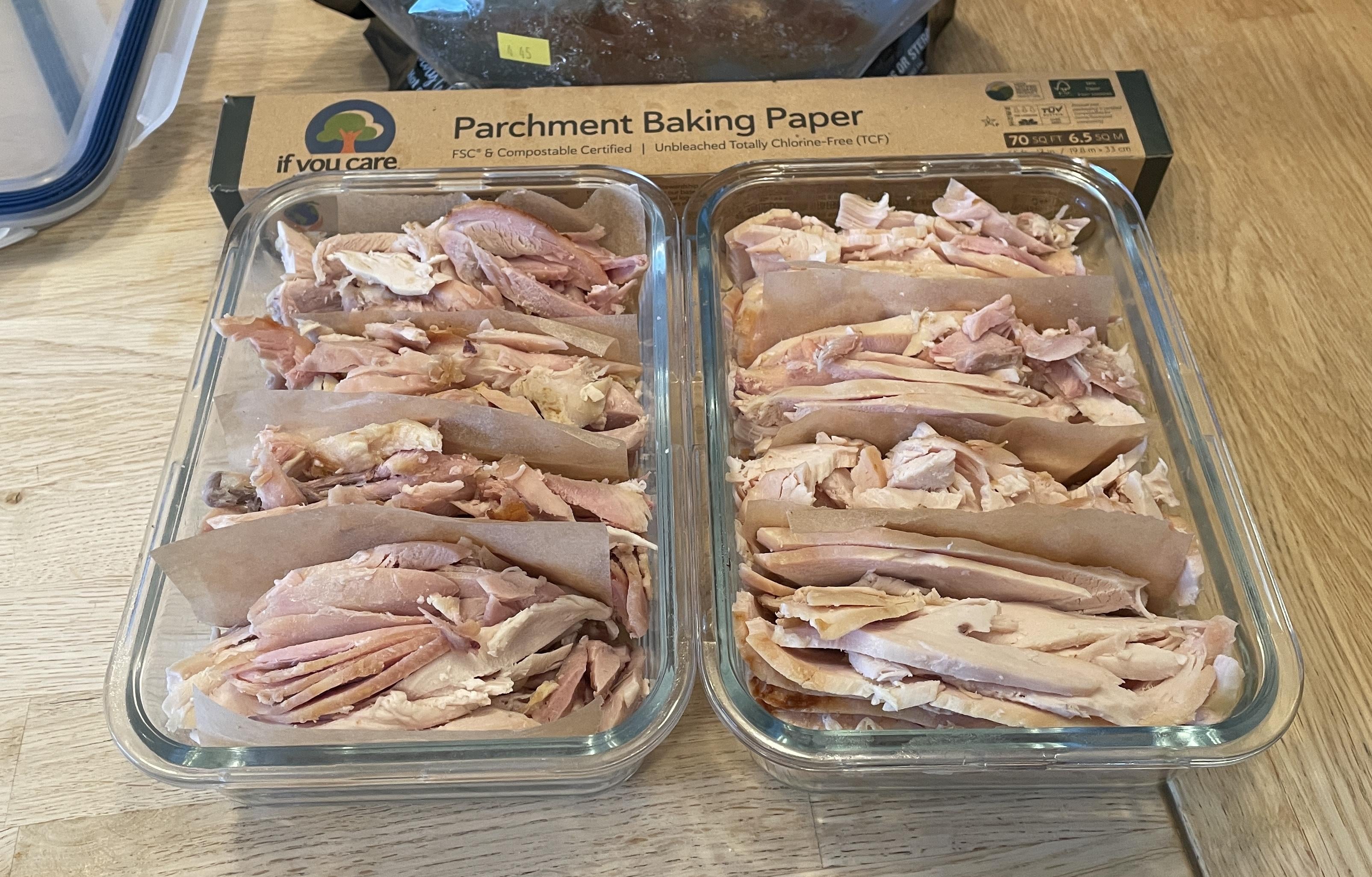 Partitioning with parchment paper and freezing makes it easy to section off as needed. You can use a butter knife to wedge in there and release each section. Or I'll plop the water-tight container in some warm water to free it.
