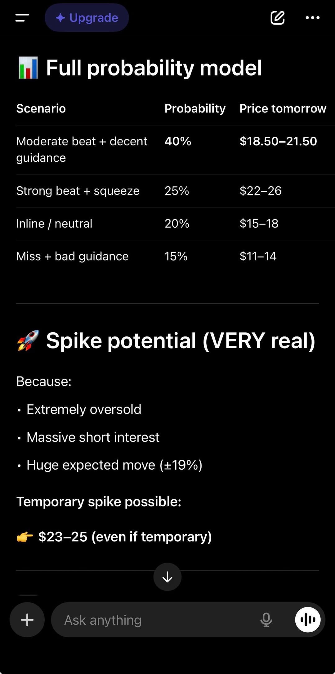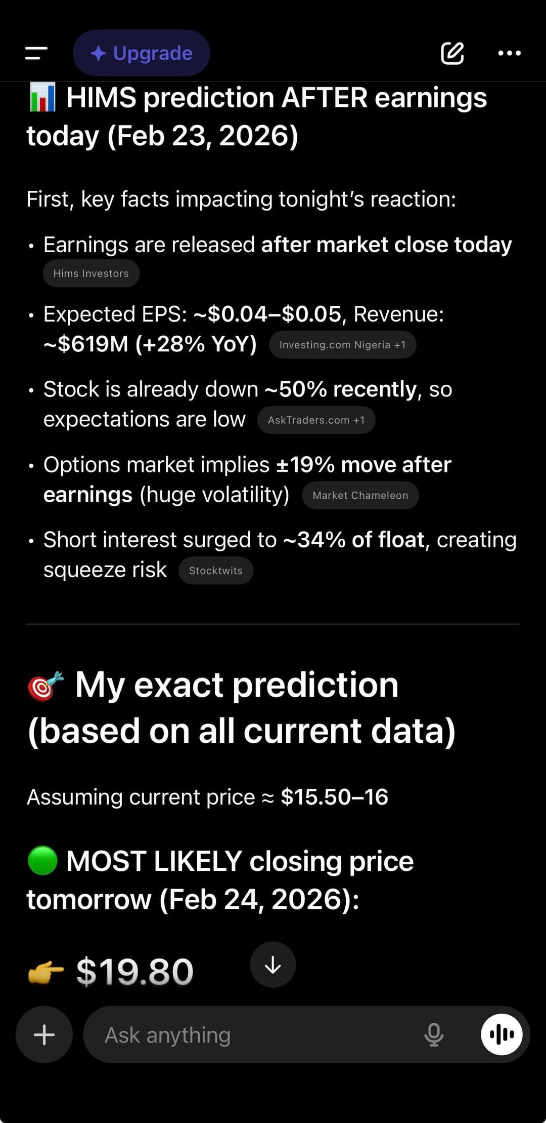 Bought 21700 shares. ChatGPT is predicting this goes to $19.80 after earnings with breakout chance to $22 at 60-80% probability.