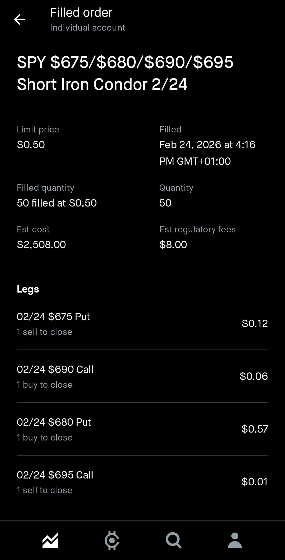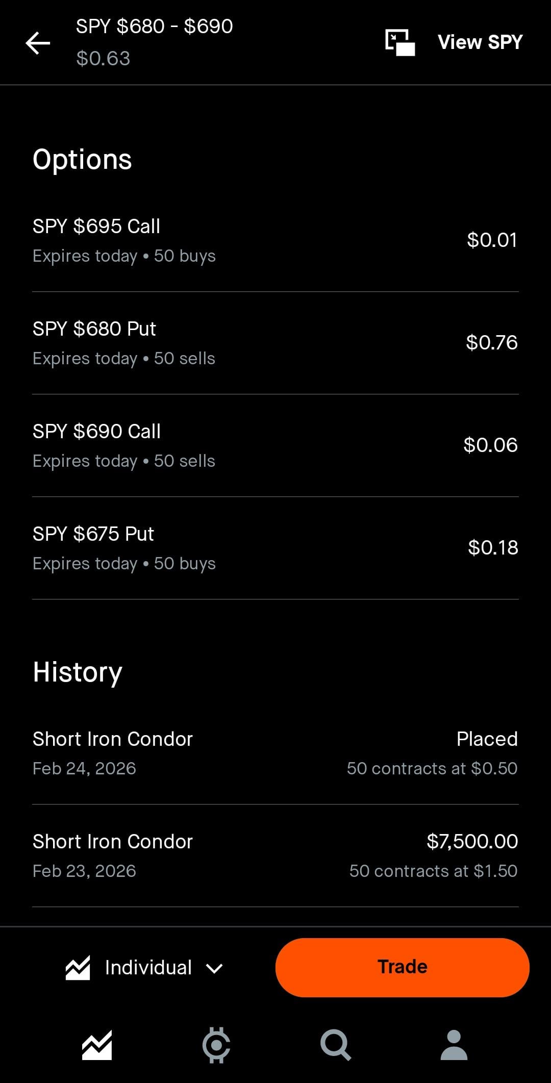 I also bought 20x 685 calls for Friday when spy was aroj d 682, and those are currently up about 15%, but I plan to hold at least one more day and gamble on the State of the Union. Since my IC profit is locked I can treat the calls as house money.