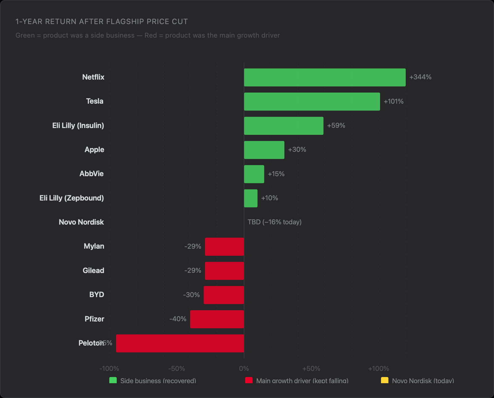 In every recovery case the product being cut was a small or declining part of the business — Lilly's insulin, Tesla's margin on base models, Apple's China iPhone pricing. In every case where the stock kept falling the product being cut was the main growth driver and there was no replacement ready.