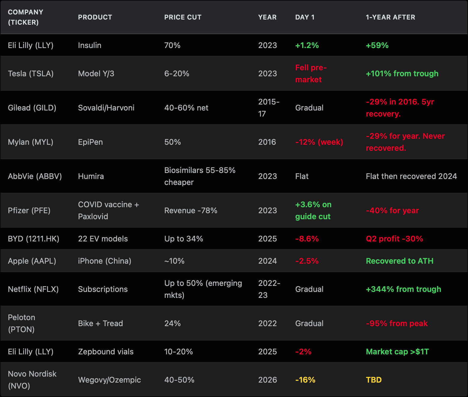 I went back and found every major case of a company cutting flagship product prices 30%+ under pressure and tracked what happened to the stock.