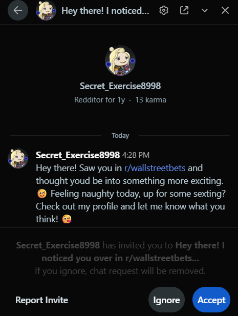 The exact same account messaged me for my interest in memes… Damn it I thought we had something special but she’s just after terrible financial advice and memes.