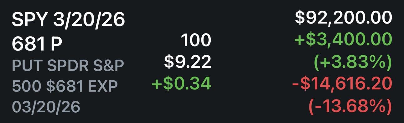 Cash_Saucey on March 3, 2026 12:45 pm I Bought a few 680 3/13 puts right before close yesterday. I think ima sell at open 😅