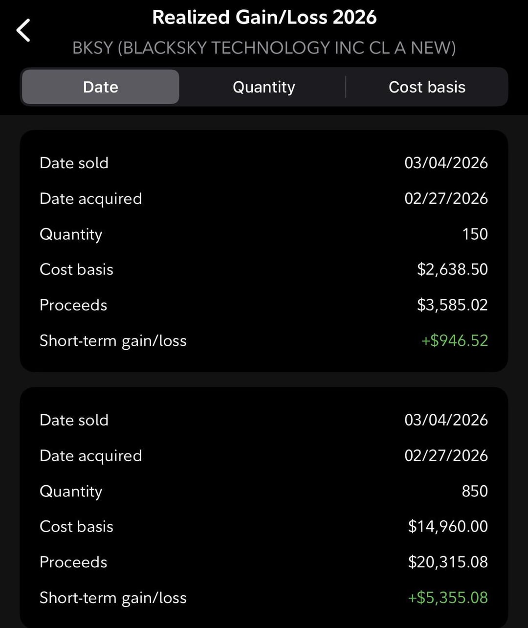 I bought 1000 shares at $17.8 last week and sold 10 $25 03/20 CCs right away, thinking there would be no way to get assigned. The war broke out and Blacksky benefits from it pumping the stock really hard. Despite juicy profits, I’m not happy because I’ve made the same mistake to rklb, qqqm etc, which amounts to $20k loss last year due to closing CCs. Why don’t I learn the simple lesson that I should stay away from options. I hope this time is different.