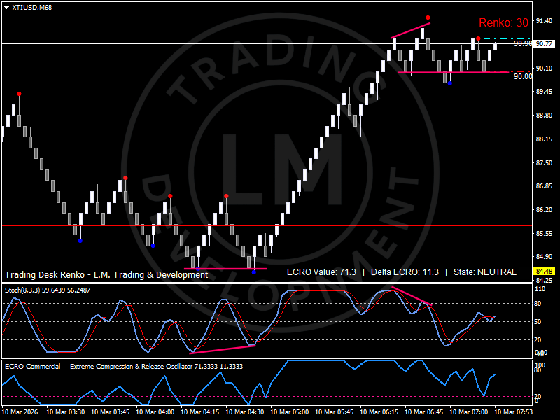 On the chart WTI pushed into the 91.40 area, then corrected and is now stabilizing around 90.00. That level is acting as the first real support after the rally.