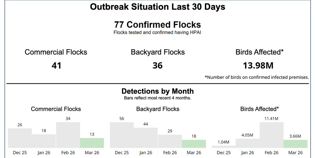 HPAI was low early on this year because colder weather kept waterways frozen and migration halted. We are seeing the same amount of migration compressed now into a shorter window starting the last week. This window overlaps with the highest period of demand for eggs – easter. I have been using [Cornell’s Bird-cast](https://birdcast.org/migration-tools/migration-forecast-maps/) and [Ducks Unlimited migration map](https://www.ducks.org/migrationmap) to monitor the migration patterns. Both sources agree that migration has begun and we are not yet at full force.