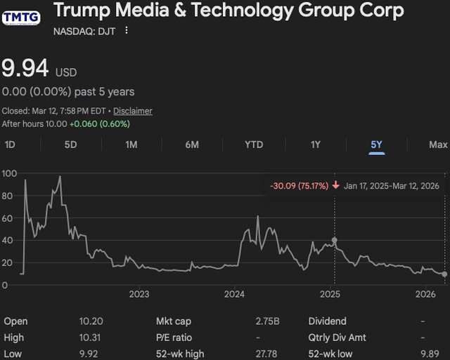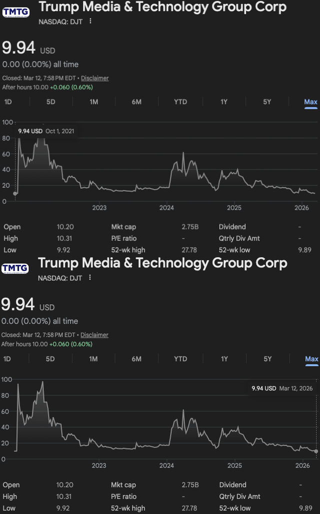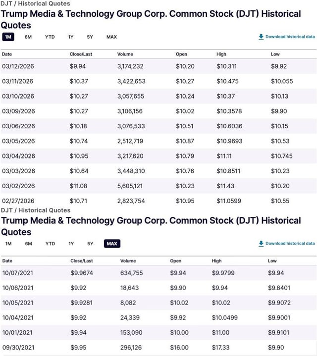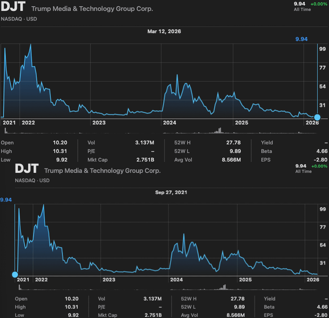 As of today, March 12, 2026: DJT (Trump Media & Technology Group Corp) closed $9.94; one cent lower than it closed on September 30, 2021 ($9.95) – according to historical quotes from Nasdaq. Four and a half years later, the meme stock has lost ALL of its gains.