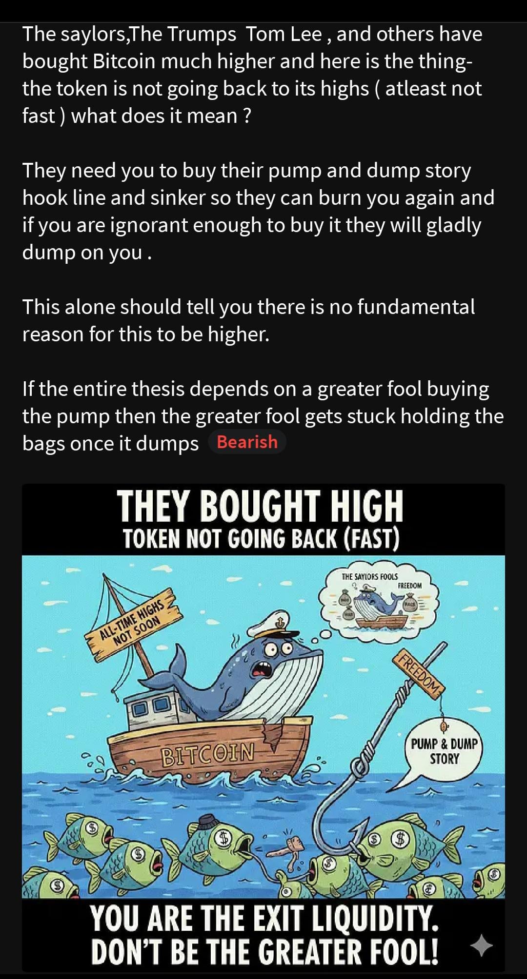 If the entire thesis depends on a greater fool buying the pump then the greater fool gets stuck holding the bags once it dumps