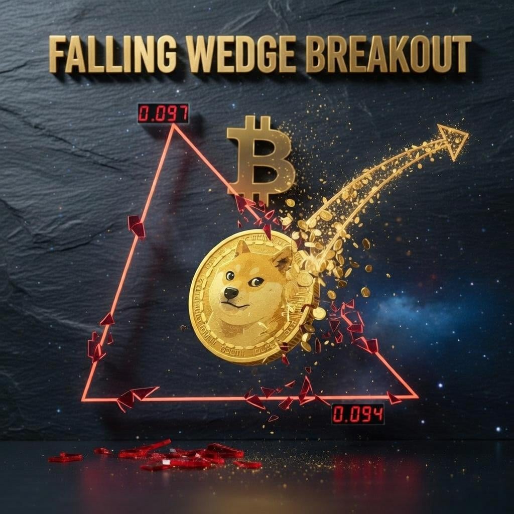 Falling wedges on weekly charts resolve upside roughly 68% of the time. Pattern tightening, volume declining — classic pre-breakout signals. If $0.097 breaks clean, capital rotation from BTC into DOGE becomes the trade.
