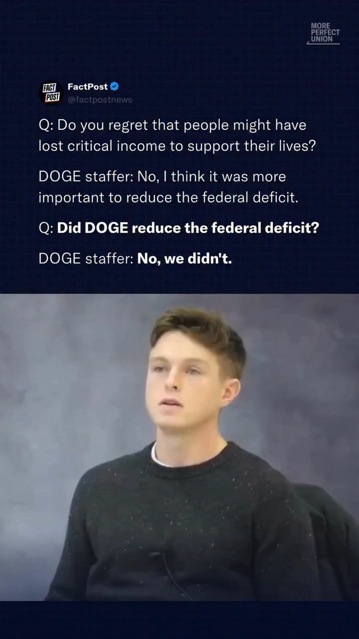 DOGE staffer admits DOGE did not reduce the federal deficit — despite costing hundreds of thousands of people their jobs. https://v.redd.it/jc61fs6160qg1 Posted by Conscious-Quarter423