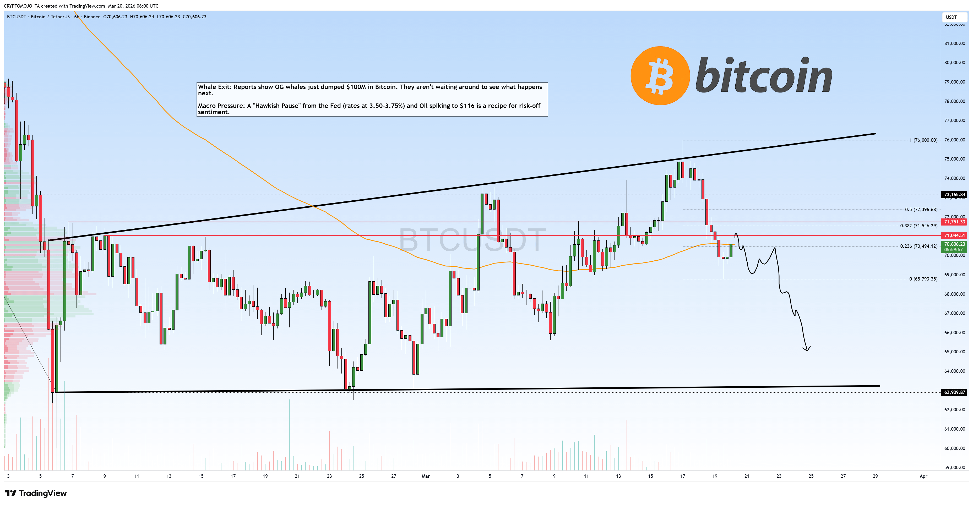 The Rejection: $BTC couldn't hold that channel top and we’re officially losing the $70.4k support. Look at the 0.236 Fib, it's cracking. If we don't reclaim that orange EMA soon, that hand-drawn path to $63k isn't just a guess… it’s the magnet.