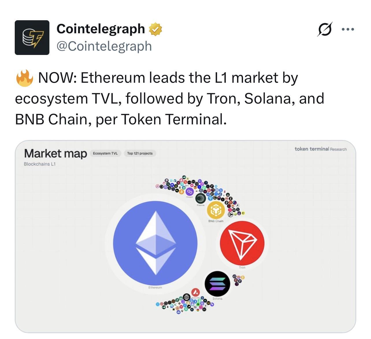 Ethereum ecosystem TVL ranks first in the L1 market