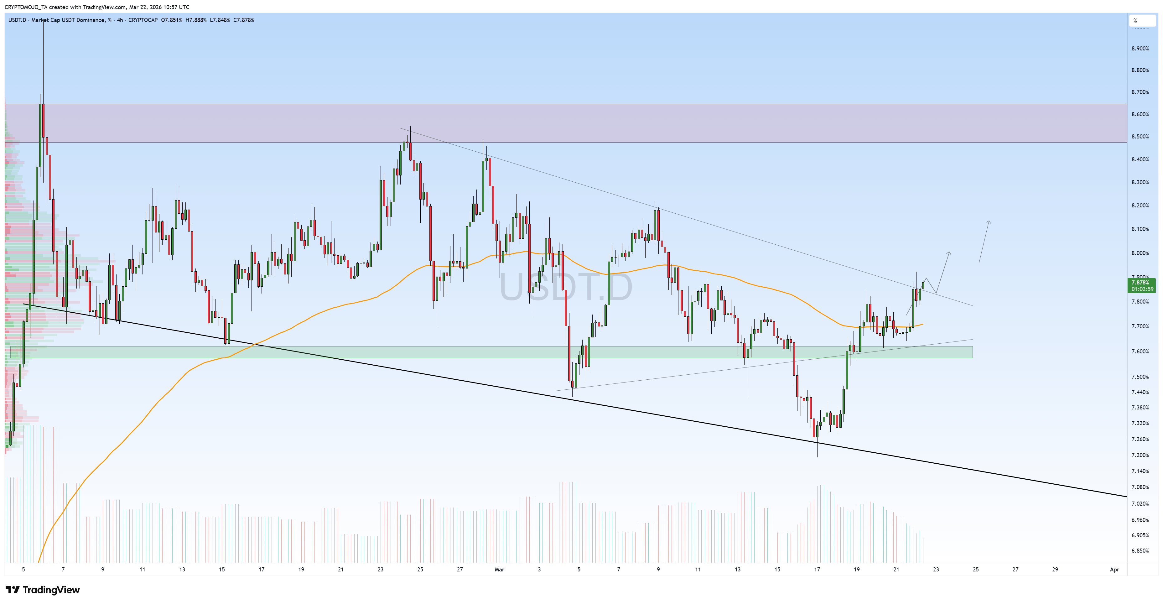 USDT Dominance just pushed up from support and broke through resistance; there’s clear strength here.